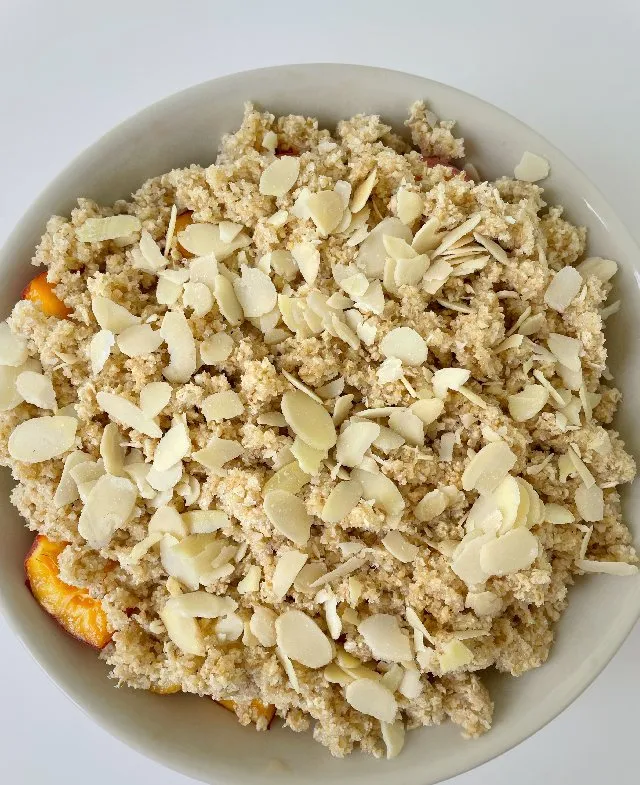 Я щиро вважаю, що б ви не запекли під шаром хрусткої румʼяної крихти — вийде чудово. Персики, яблука, сливи, груші — змінюєте фрукти і щоразу отримуєте нову страву до сніданку чи просто на десерт. Сьогодні у мене є персики та прекрасний настрій, а значить буде і смачненьке 🥰