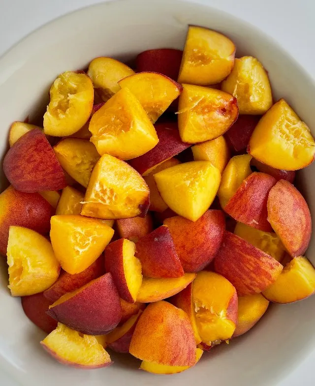 Увімкніть духовку на 170 С. Тим часом помийте та наріжте персики невеликими шматочками, викладіть у форму для запікання.