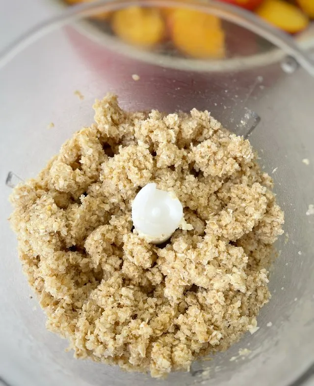У чашу блендера складіть холодне масло, порізане невеликими шматочками, цукор та вівсяні пластівці і все разом пробийте в крихту.