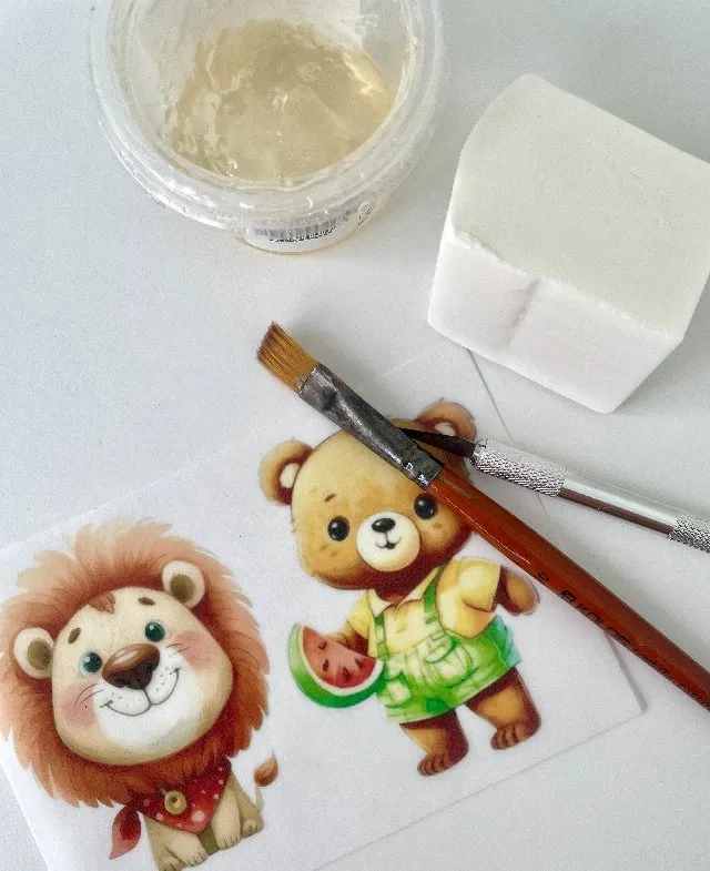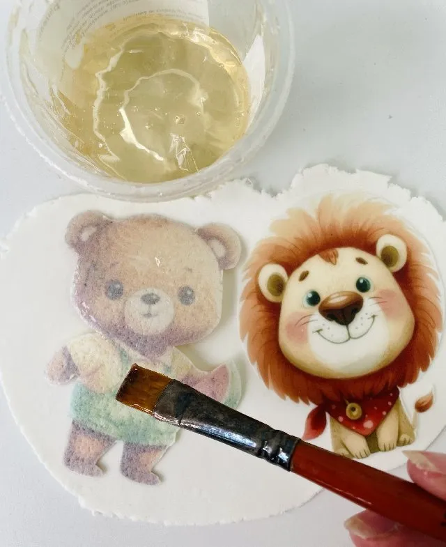 - Шматочок цукрової пасти необхідно гарно розімʼяти і тонко розкатати, припудрюючи крохмалем, щоб мастика не прилипала. Картинку акуратно вирізати по контуру гострими ножицями (важливо саме гострі, щоб краї при вирізуванні не ламалися). Змастити зворотній бік картинки нейтральним гелем, приклеїти до розкатаної мастики та покласти зверху кухонну дощечку. Це потрібно для того, щоб картинка «розслабилася» і стала рівною, бо від вологи вона спочатку трохи вигинається. Достатньо так потримати картинки хвилин 10.