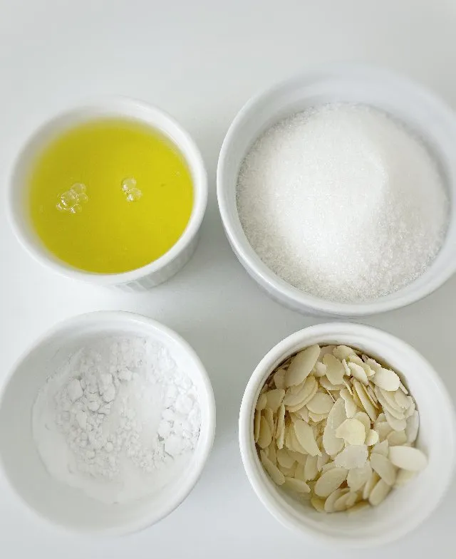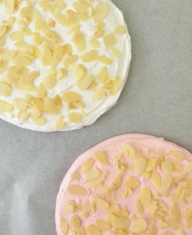 На пергаменті накресліть кола діаметром 16-17см. Зазвичай на деко поміщається два коржі, тому можна використати два дека і випікати три коржі одночасно. Відсадіть меренгу в межах кола, підрівняйте спатулою. Зверху рівномірно присипте мигдальними пластівцями.