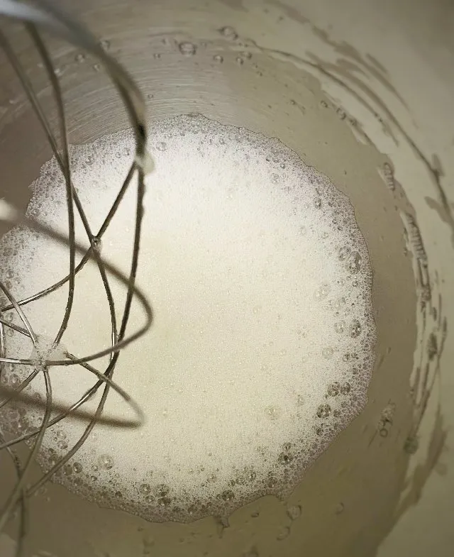 - Охолоджені білки починайте збивати на невисокій швидкості, так піна буде мати дрібніші, але більш стійкі бульбашки. Без цукру збиваємо білки до стану “пивної піни”. -