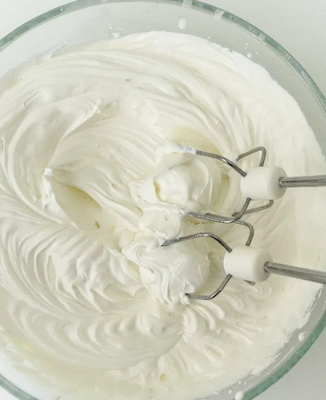 - Приготуємо крем. Для цього потрібно викласти в миску маскарпоне, вершки та цукрову пудру і обережно вінчиком або міксером на найменших оборотах розмішати. Тут потрібно бути обережними, щоб не перезбити крем, процес збивання займає буквально пару хвилин, до однорідності маси.