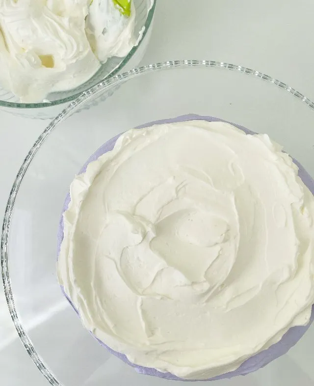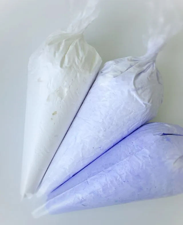 - Розділіть меренгу на три частини. Одну залиште білою, другу підфарбуйте в ніжно бузковий колір і третю — в більш темний колір (це потрібно виключно для інстаграмного ефекту, ви можете залишити всі три коржі білими ). Викладіть меренгу в кондитерські мішки, відріжте кінчик (щоб діаметр отвору був десь 1,5см).