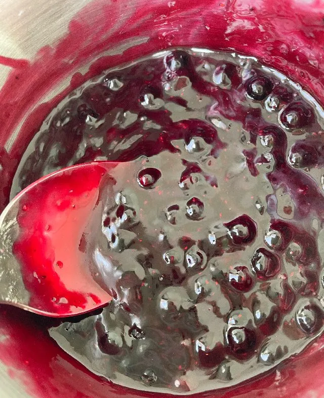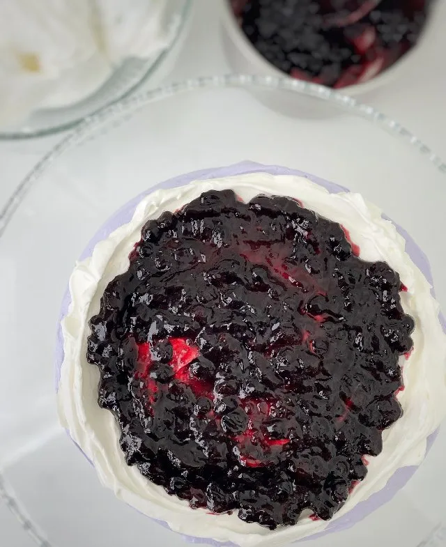 - На крем, не доходячи до країв, викласти половину чорничної начинки. Накрити наступним коржом і повторити.