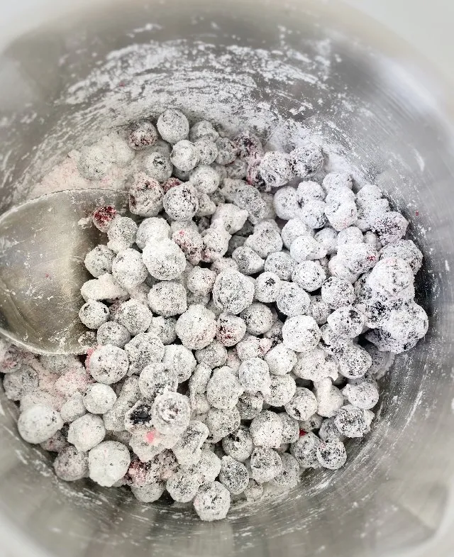 - Поки коржі випікаються, приготуємо чорничну начинку. Змішайте цукор з крохмалем, обваляйте в цій суміші чорниці.