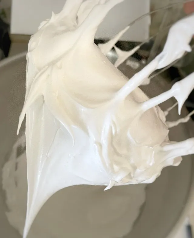 - Не перестаючи збивати, поступово починайте додавати цукор. Зручно орієнтуватися на схему 1 столова ложка цукру — кожні 30 секунд (це орієнтовно, не треба стояти з секундоміром). Ввели весь цукор і продовжуйте збивання, поки меренга не стане стійкою і цукор не розчиниться. В кінці збивання всипте крохмаль і обережно розмішайте.