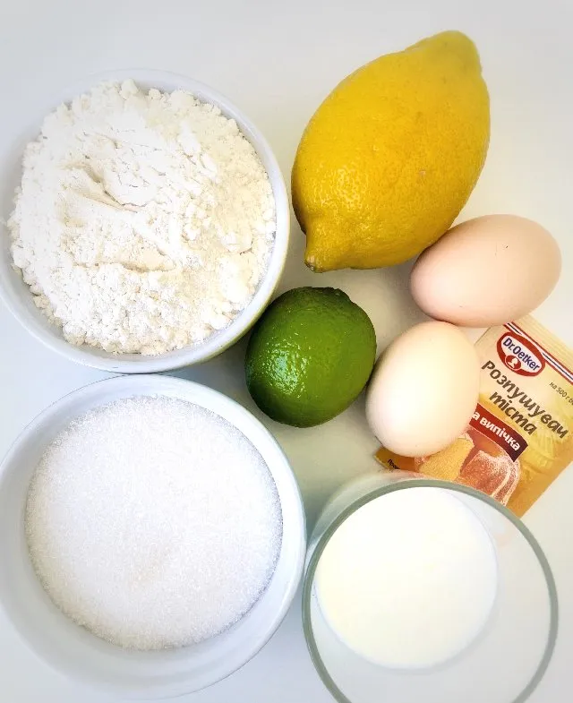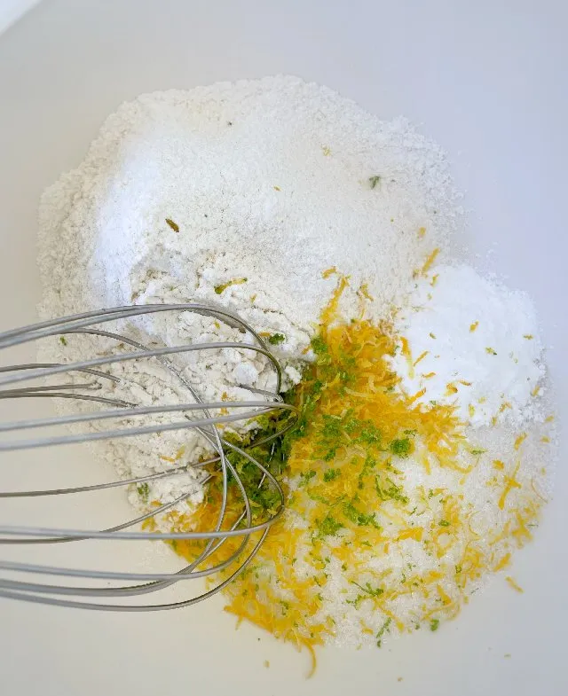 - Увімкніть духовку на 160С. В мисці змішайте всі сухі інгредієнти: борошно, цукор, розпушувач, сіль, натріть туди цедру з одного лимона та лайма, все гарно перемішайте.