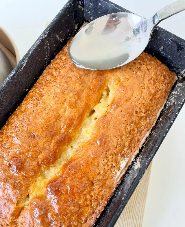 - Коли дістали з духовки готовий кекс, ще гарячим пролийте його десь 2/3 сиропу по всьому верху, по боках, щоб він весь просочився. Навіть якщо вам здасться, що сиропу забагато, лийте, просто повірте 😉. Залиште кекс вистигати в формі.