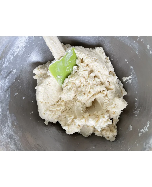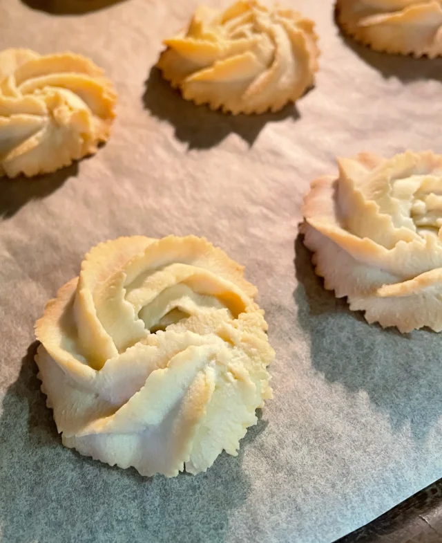 Перекладіть тісто в кондитерський мішок з насадкою. Рекомендую взяти якомога міцніший мішок, тому що тісто доволі щільне, щоб він не прорвався (перший, який я взяла, саме так і зробив 😄). Відсадіть печиво на пергамент.