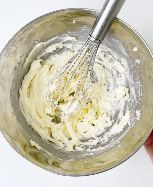 Мʼяке масло збити з цукровою пудрою, поки маса стане пишною і побіліє.