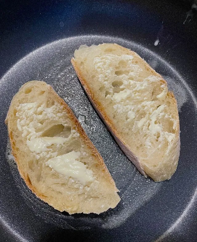 Наріжте багет на шматочки товщиною приблизно 1см. Намастіть на них трошки вершкового масла, злегка присипте цукром та підрумʼяньте з обох боків. У вас вийде хрустка карамелізована скоринка.