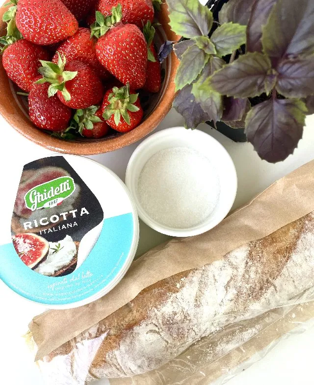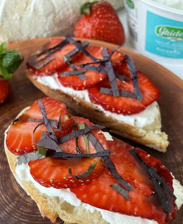 Змастіть шматочки багета зверху рікотою, викладіть тонко нарізану полуницю. Зверху присипте нарізаним базиліком та збризніть парою крапель бальзамічного соусу.